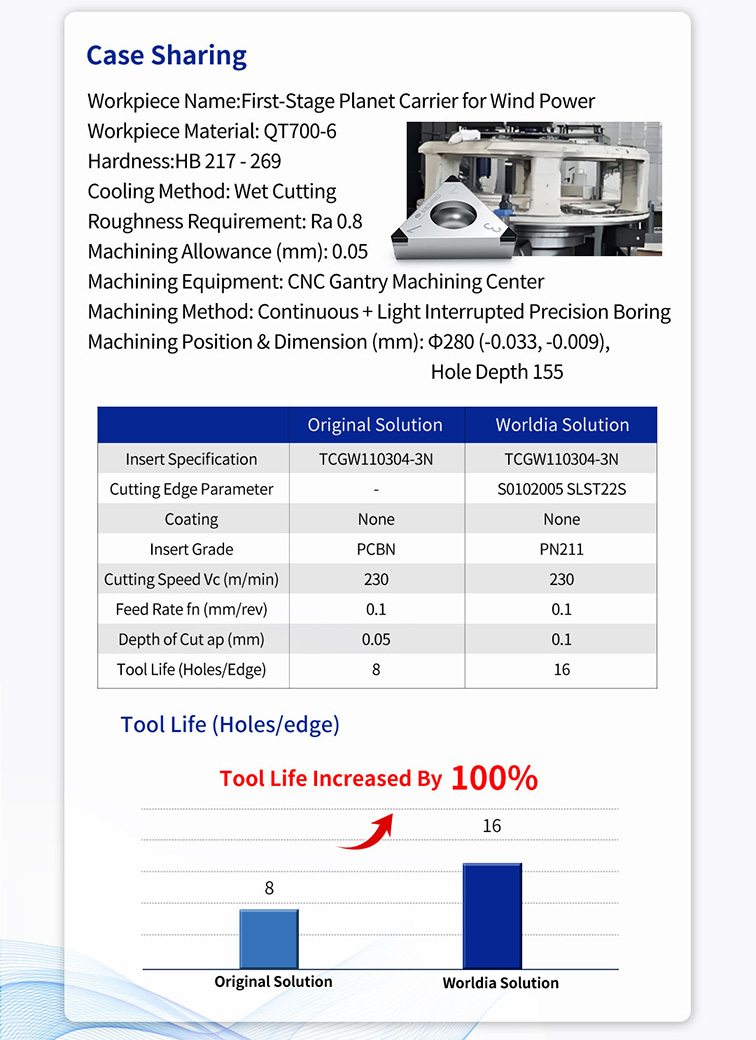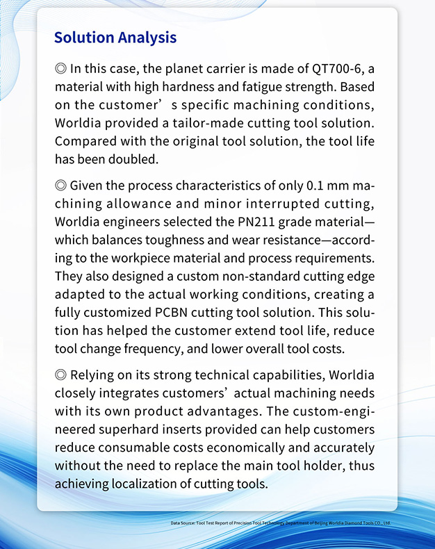Tato případová studie představuje na zakázku navržené vložky PCBN společnosti Worldia pro přesné vrtání montážních otvorů ložisek v planetárních nosičích prvního stupně. Náhradou původní mezinárodní značky řezacích nástrojů umožňuje naše řešení zákazníkům prodloužit životnost nástroje, snížit frekvenci výměny nástroje a snížit náklady na nástroje uprostřed intenzivní konkurence na trhu.