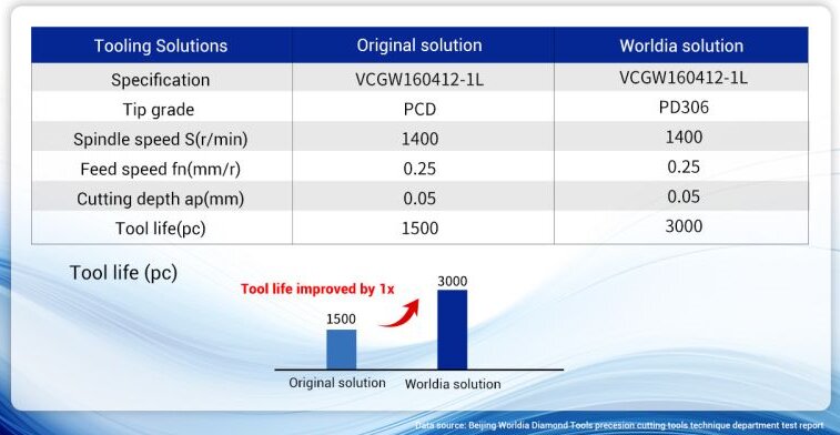 Aluminum alloy wheels are widely used in passenger cars due to their light weight, fast heat dissipation, good shock absorption, diverse and fashionable appearance, precise size, good balance, and easy manufacturing. This case is a case of Worldia PCD turning inserts processing the outer spokes of aluminum alloy wheels.