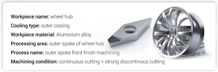 Aluminum alloy wheels are widely used in passenger cars due to their light weight, fast heat dissipation, good shock absorption, diverse and fashionable appearance, precise size, good balance, and easy manufacturing. This case is a case of Worldia PCD turning inserts processing the outer spokes of aluminum alloy wheels.