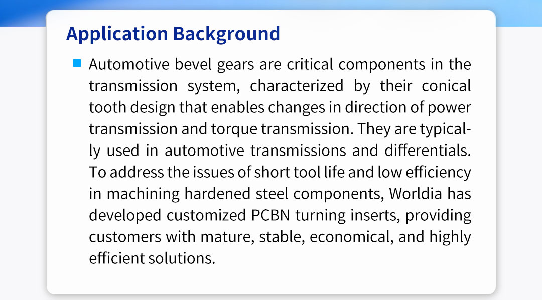 Automotive bevel gears are critical components in the transmission system, characterized by their conical tooth design that enables changes in direction of power transmission and torque transmission. They are typically used in automotive transmissions and differentials. To address the issues of short tool life and low efficiency in machining hardened steel components, Worldia has developed customized PCBN turning inserts, providing customers with mature, stable, economical, and highly efficient solutions.