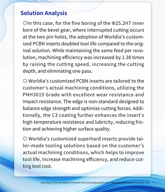 ◎ In this case, for the fine boring of the Φ25.2H7 inner bore of the bevel gear, where interrupted cutting occurs at the two pin holes, the adoption of Worldia’s customized PCBN inserts doubled tool life compared to the original solution. While maintaining the same feed per revolution, machining efficiency was increased by 1.38 times by raising the cutting speed, increasing the cutting depth, and eliminating one pass.