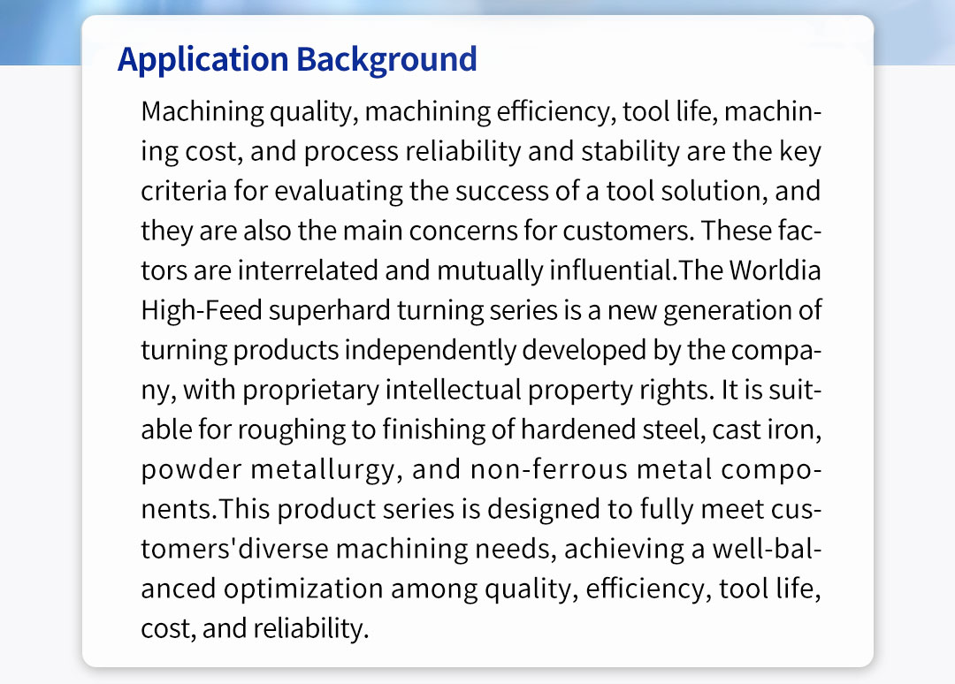 Machining quality, machining efficiency, tool life, machining cost, and process reliability and stability are the key criteria for evaluating the success of a tool solution, and they are also the main concerns for customers. These factors are interrelated and mutually influential.The Worldia High-Feed superhard turning series is a new generation of turning products independently developed by the company, with proprietary intellectual property rights. It is suitable for roughing to finishing of hardened steel, cast iron, powder metallurgy, and non-ferrous metal components.This product series is designed to fully meet customers’ diverse machining needs, achieving a well-balanced optimization among quality, efficiency, tool life, cost, and reliability.