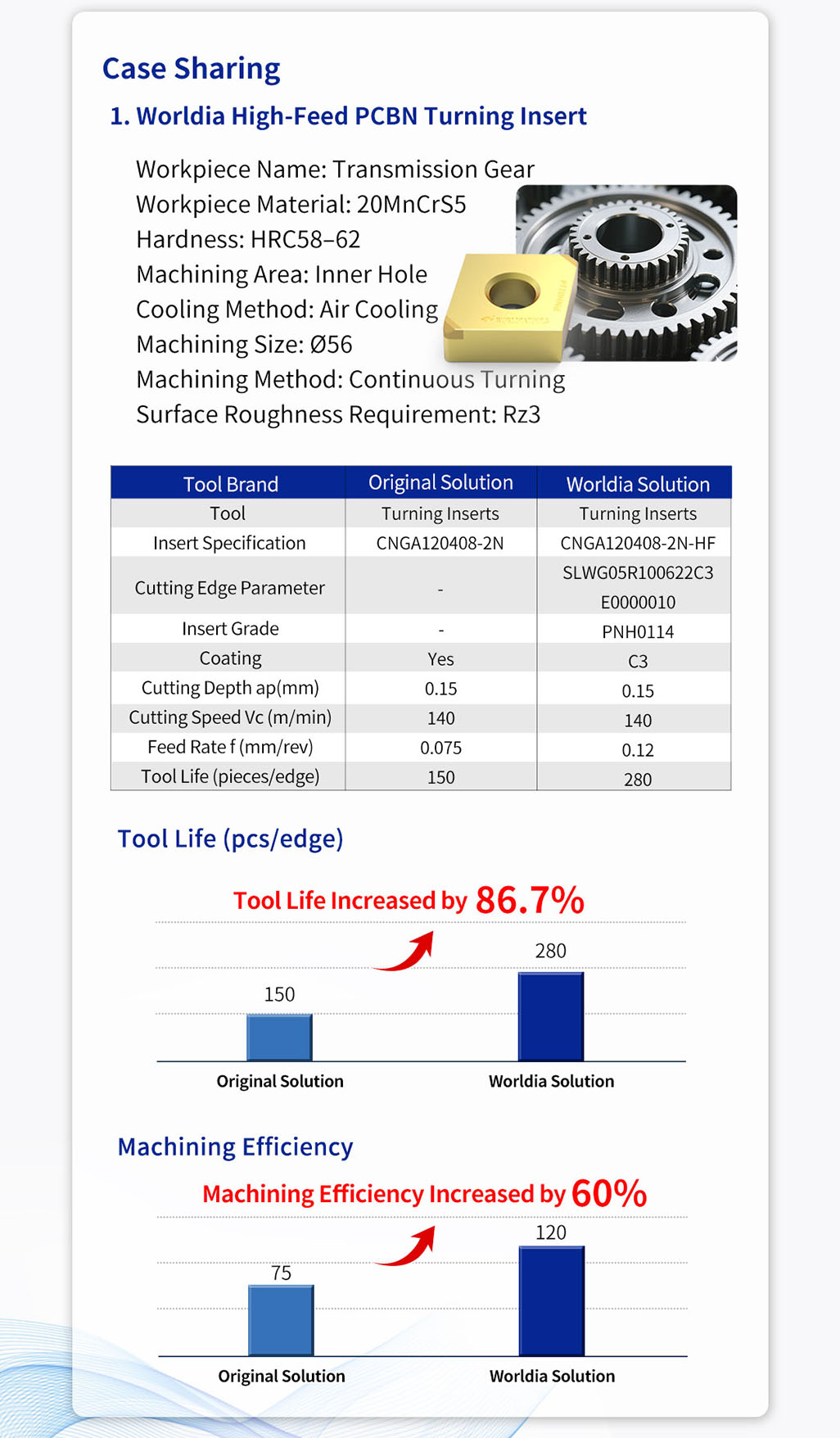 * In Case 1, under the same cutting speed and depth of cut, and while meeting the customer’s machining quality requirements, the Worldia High-Feed PCBN turning solution improved machining efficiency by 60% by increasing the feed rate of the machine, and the tool life was extended by 86.7%. The solution successfully replaced the original imported tool and achieved key performance targets in terms of machining efficiency, tool life, and machining cost.
