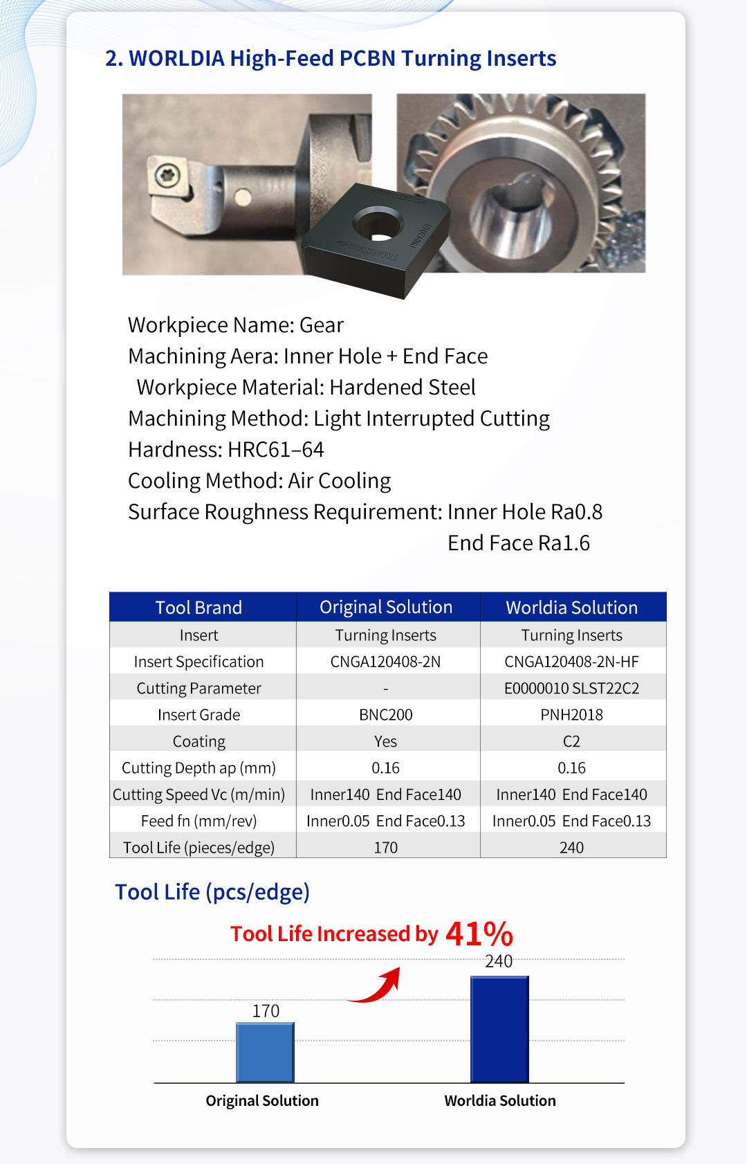 * In Case 2, under the same cutting parameters and working conditions, the Worldia High-Feed turning solution extended tool life by 41% compared with the original imported PCBN tool. This improvement helped the customer increase tool life, reduce machining costs, and ultimately successfully replace the imported tool.