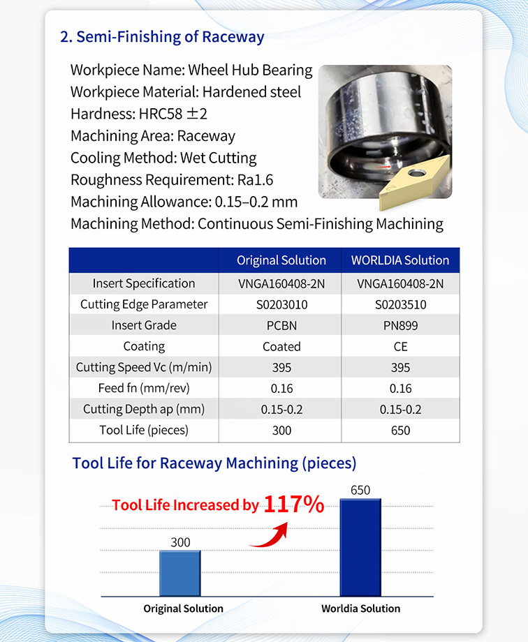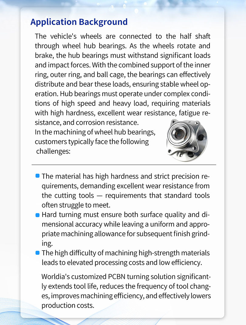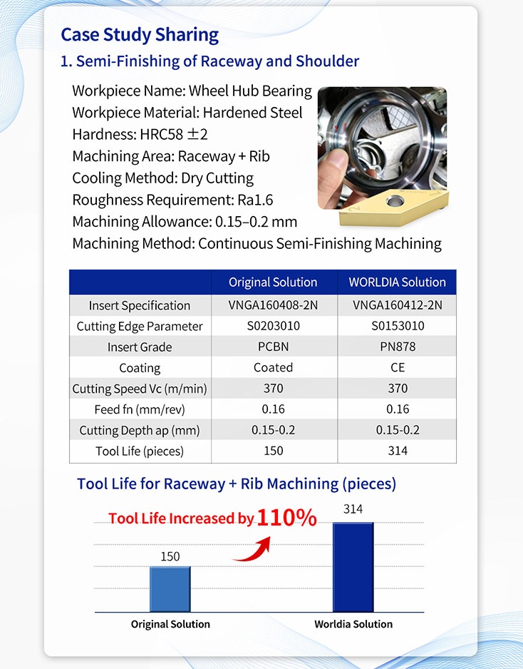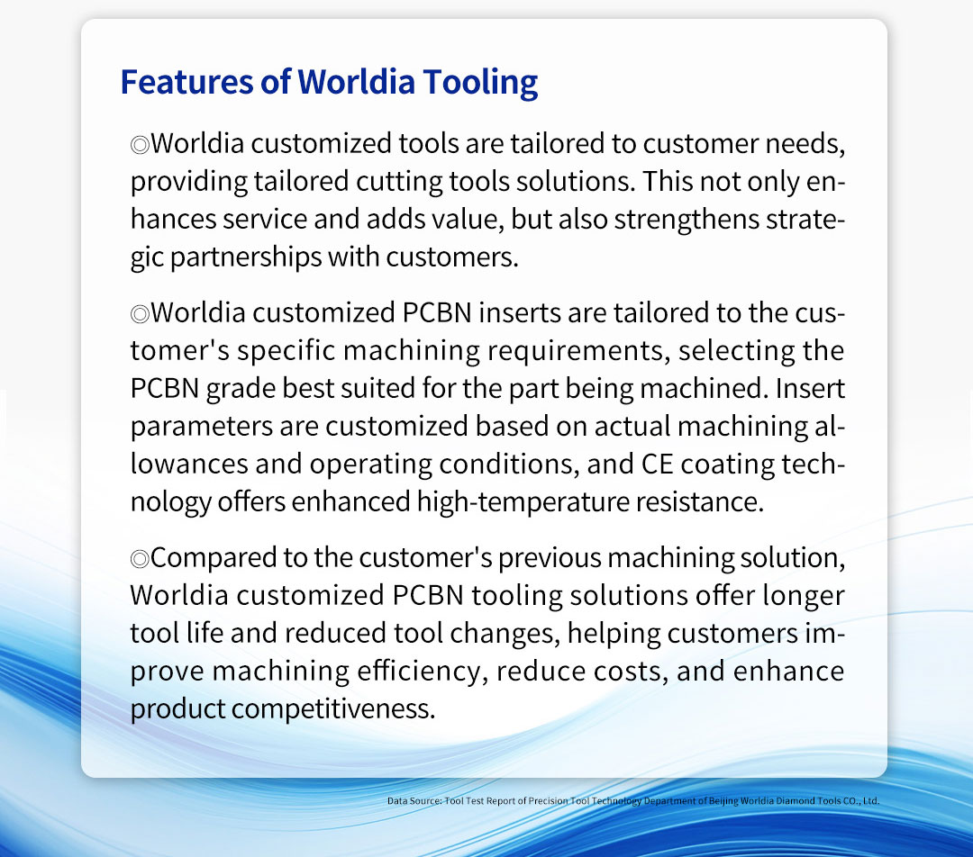 Worldia’s customized PCBN turning solution significantly extends tool life, reduces the frequency of tool changes, improves machining efficiency, and effectively lowers production costs.