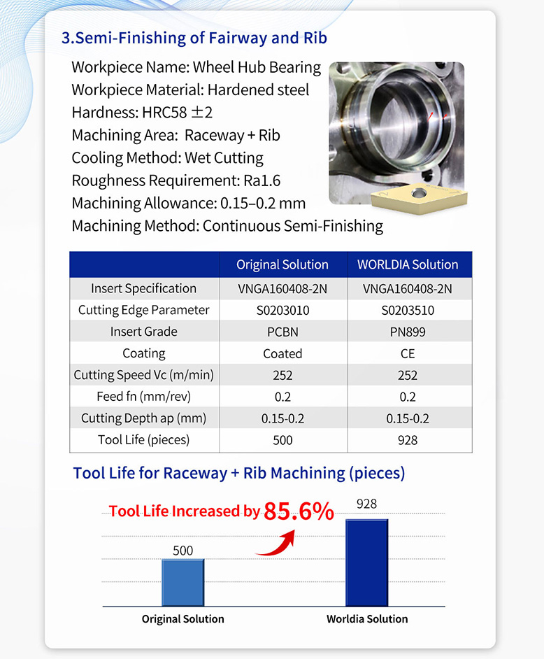 * Compared to the customer’s previous machining solution, Worldia customized PCBN tooling solutions offer longer tool life and reduced tool changes, helping customers improve machining efficiency, reduce costs, and enhance product competitiveness.