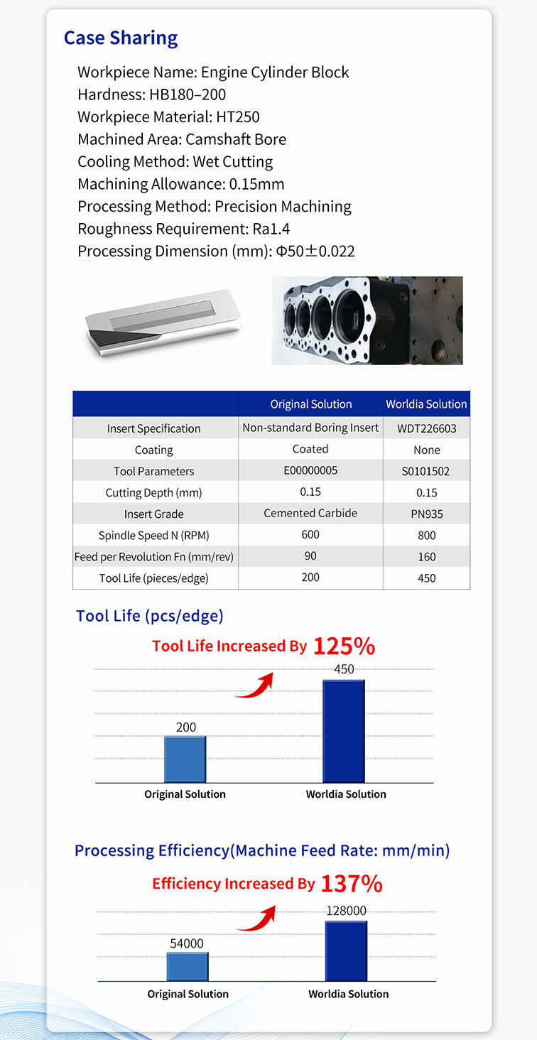 ◎Worldia’s customized PCBN boring inserts: Targeting the customer’s part material and process characteristics, the PN935 grade with excellent wear resistance was selected, and non-standard cutting edges were customized based on the machining allowance and actual working conditions. Compared with the customer’s original solution, the tool life has increased by 125%, and the machining efficiency has improved by 137%.
