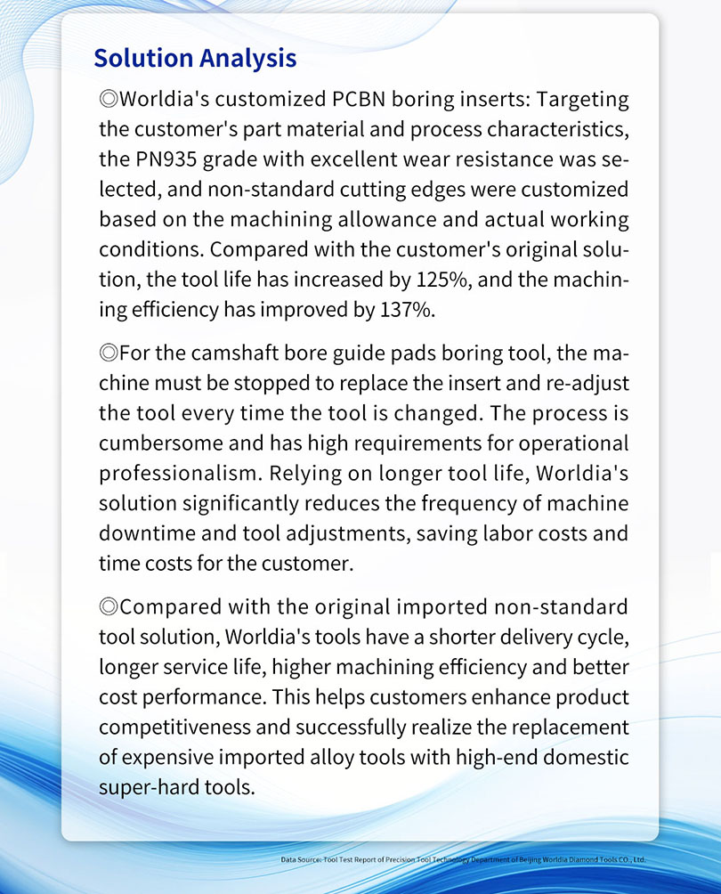 ◎For the camshaft bore guide pads boring tool, the machine must be stopped to replace the insert and re-adjust the tool every time the tool is changed. The process is cumbersome and has high requirements for operational professionalism. Relying on longer tool life, Worldia’s solution significantly reduces the frequency of machine downtime and tool adjustments, saving labor costs and time costs for the customer.