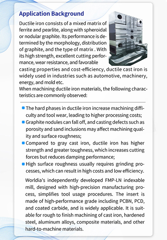 Worldia’s independently developed FMP-LN indexable mill, designed with high-precision manufacturing process, simplifies tool usage procedures. The insert is made of high-performance grade including PCBN, PCD, and coated carbide, and is widely applicable. It is suitable for rough to finish machining of cast iron, hardened steel, aluminum alloys, composite materials, and other hard-to-machine materials.