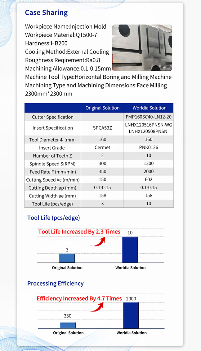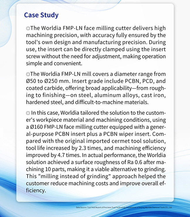 ◎ In this case, Worldia tailored the solution to the customer’s workpiece material and machining conditions, using a Ø160 FMP-LN face milling cutter equipped with a general-purpose PCBN insert plus a PCBN wiper insert. Compared with the original imported cermet tool solution, tool life increased by 2.3 times, and machining efficiency improved by 4.7 times. In actual performance, the Worldia solution achieved a surface roughness of Ra 0.6 after machining 10 parts, making it a viable alternative to grinding. This “milling instead of grinding” approach helped the customer reduce machining costs and improve overall efficiency.