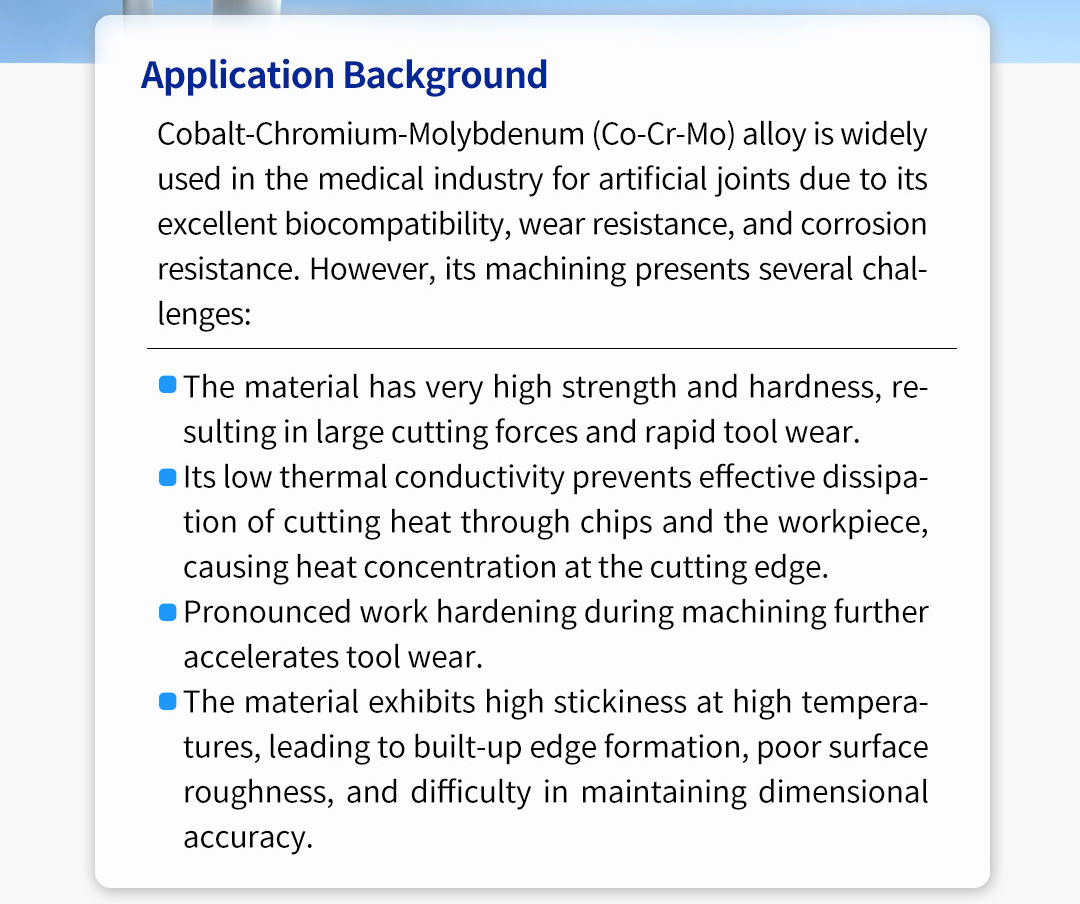 Cobalt-Chromium-Molybdenum (Co-Cr-Mo) alloy is widely used in the medical industry for artificial joints due to its excellent biocompatibility, wear resistance, and corrosion resistance. However, its machining presents several challenges:
