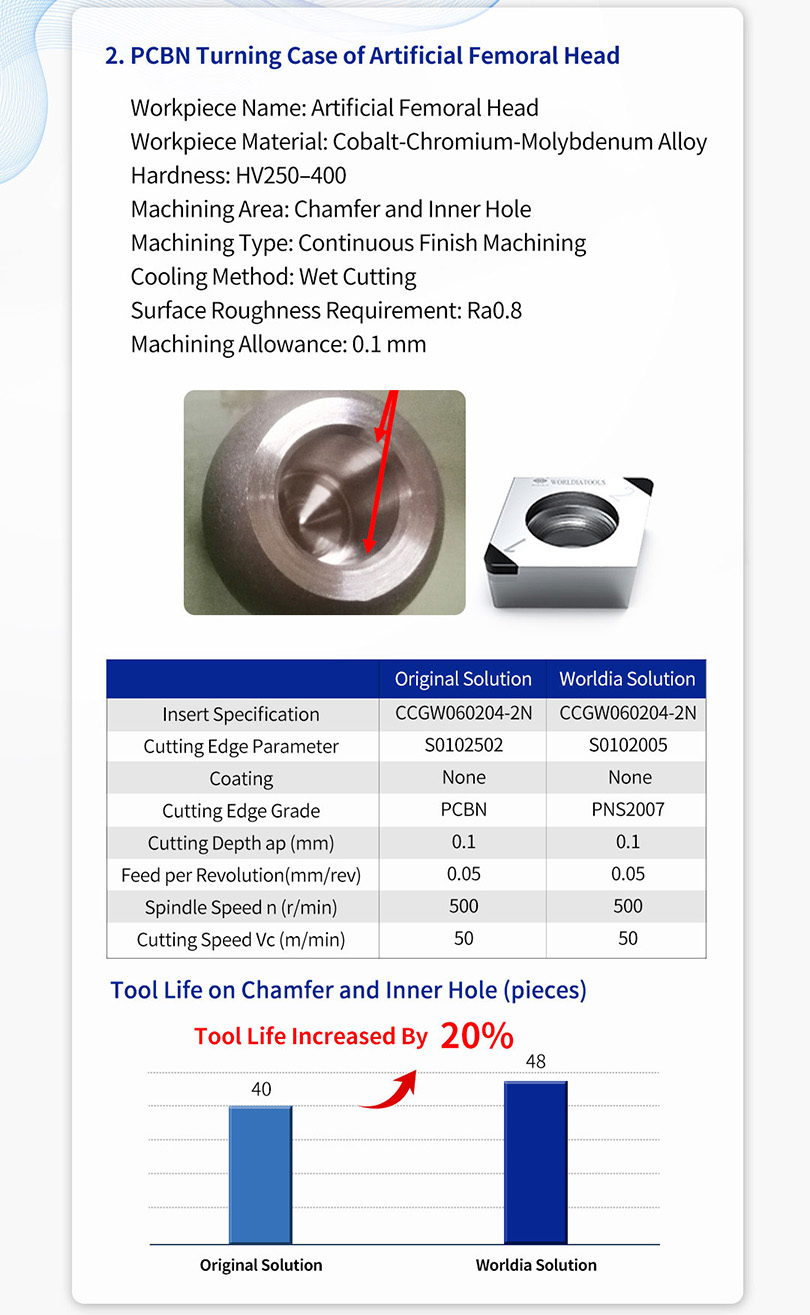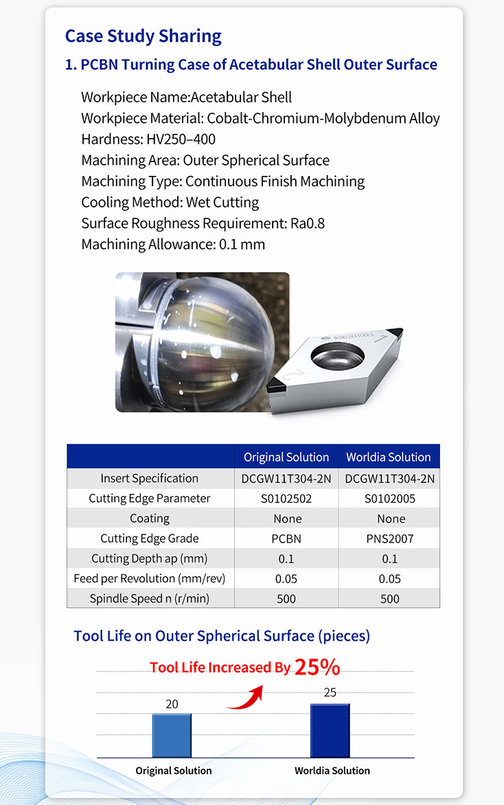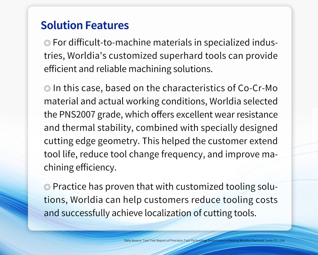 * In this case, based on the characteristics of Co-Cr-Mo material and actual working conditions, Worldia selected the PNS2007 grade, which offers excellent wear resistance and thermal stability, combined with specially designed cutting edge geometry. This helped the customer extend tool life, reduce tool change frequency, and improve machining efficiency.