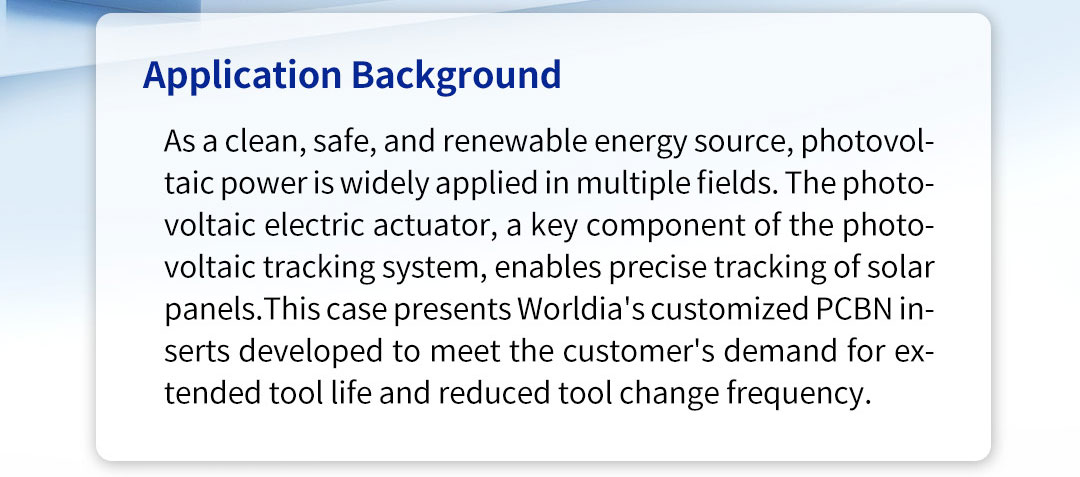 As a clean, safe, and renewable energy source, photovoltaic power is widely applied in multiple fields. The photovoltaic electric actuator, a key component of the photovoltaic tracking system, enables precise tracking of solar panels. This case presents Worldia’s customized PCBN inserts developed to meet the customer’s demand for extended tool life and reduced tool change frequency.