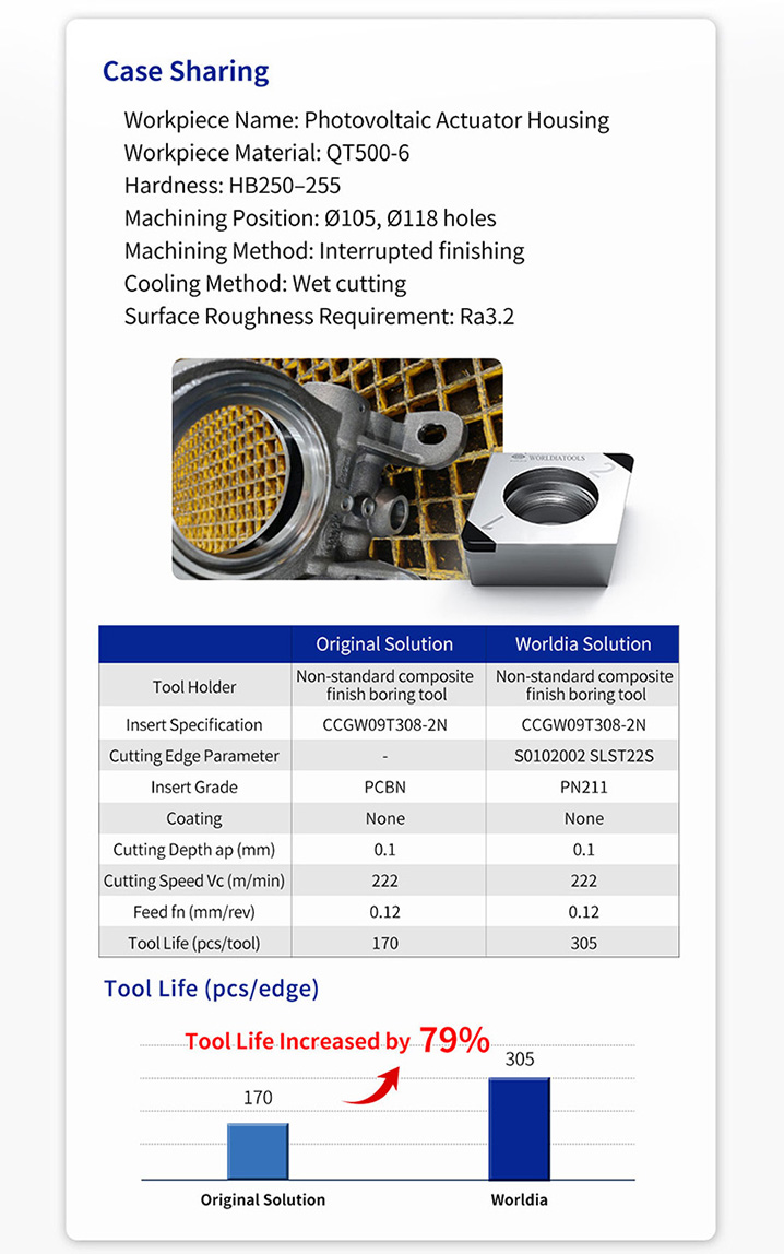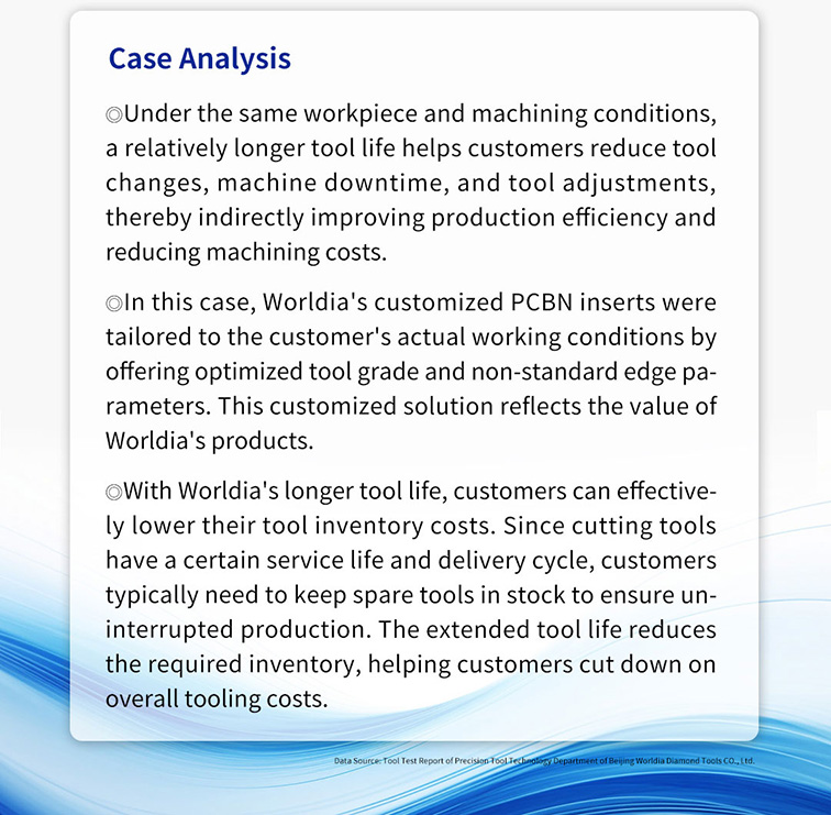 * In this case, Worldia’s customized PCBN inserts were tailored to the customer’s actual working conditions by offering optimized tool grade and non-standard edge parameters. This customized solution reflects the value of Worldia’s products.