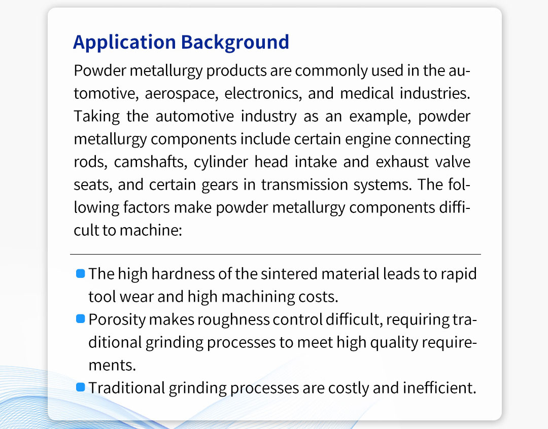 Powder metallurgy products are commonly used in the automotive, aerospace, electronics, and medical industries. Taking the automotive industry as an example, powder metallurgy components include certain engine connecting rods, camshafts, cylinder head intake and exhaust valve seats, and certain gears in transmission systems. The following factors make powder metallurgy components difficult to machine: