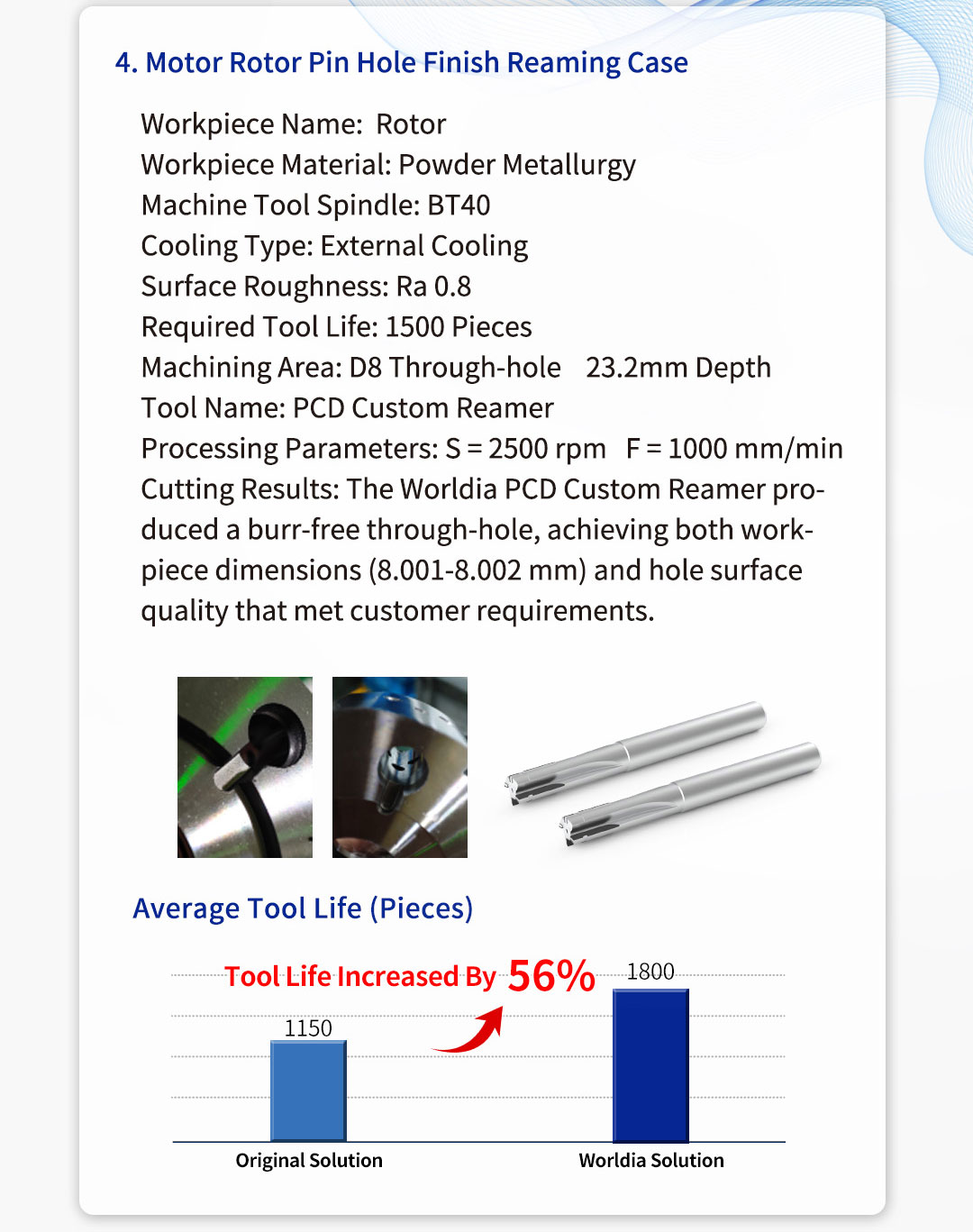 @Worldia’s customized PCD and PCBN reamers are made from high-quality imported materials with excellent wear resistance. Combined with specially designed cutting edges for superior sharpness, they effectively solve hole machining quality issues in powder metallurgy components. These reamers provide customers with stable and consistent dimensional accuracy, offering high-quality, long-life hole machining solutions.
