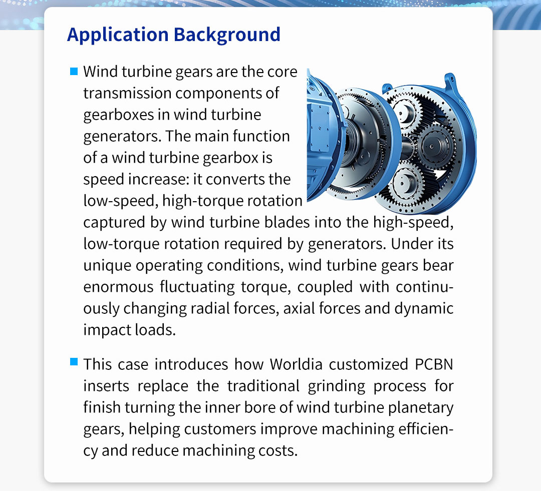 This case introduces how Worldia customized PCBN inserts replace the traditional grinding process for finish turning the inner bore of wind turbine planetary gears, helping customers improve machining efficiency and reduce machining costs.
