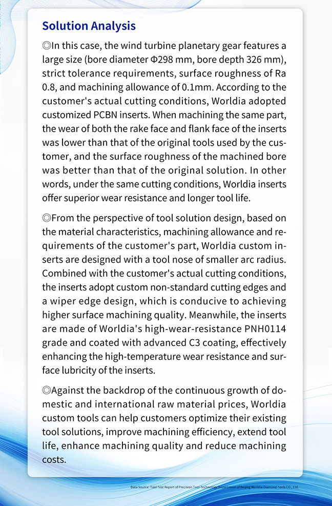 ◎In this case, the wind turbine planetary gear features a large size (bore diameter Φ298 mm, bore depth 326 mm), strict tolerance requirements, surface roughness of Ra 0.8, and machining allowance of 0.1mm. According to the customer’s actual cutting conditions, Worldia adopted customized PCBN inserts. When machining the same part, the wear of both the rake face and flank face of the inserts was lower than that of the original tools used by the customer, and the surface roughness of the machined bore was better than that of the original solution. In other words, under the same cutting conditions, Worldia inserts offer superior wear resistance and longer tool life.