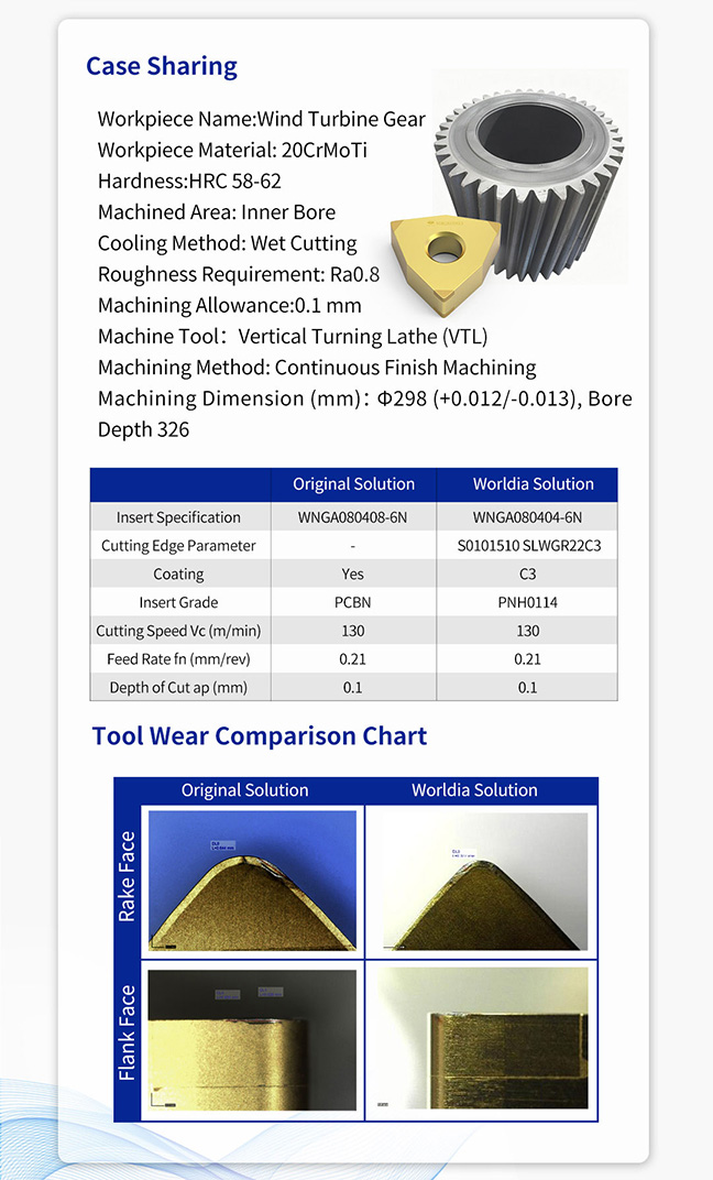 ◎In this case, the wind turbine planetary gear features a large size (bore diameter Φ298 mm, bore depth 326 mm), strict tolerance requirements, surface roughness of Ra 0.8, and machining allowance of 0.1mm. According to the customer’s actual cutting conditions, Worldia adopted customized PCBN inserts. When machining the same part, the wear of both the rake face and flank face of the inserts was lower than that of the original tools used by the customer, and the surface roughness of the machined bore was better than that of the original solution. In other words, under the same cutting conditions, Worldia inserts offer superior wear resistance and longer tool life.