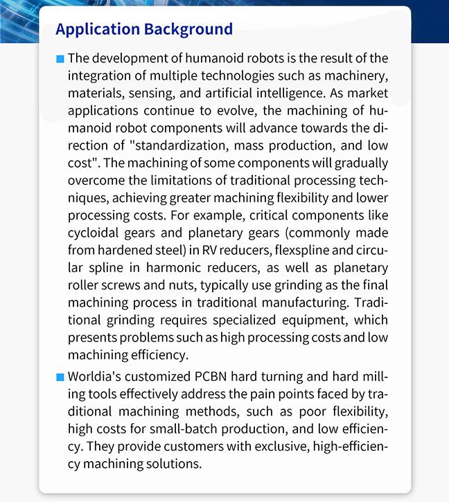 ◎Worldia’s customized superhard tools provide exclusive solutions for humanoid robot component machining with longer tool life and higher machining efficiency, tailored to the specific characteristics of the customer’s parts and their actual machining conditions.