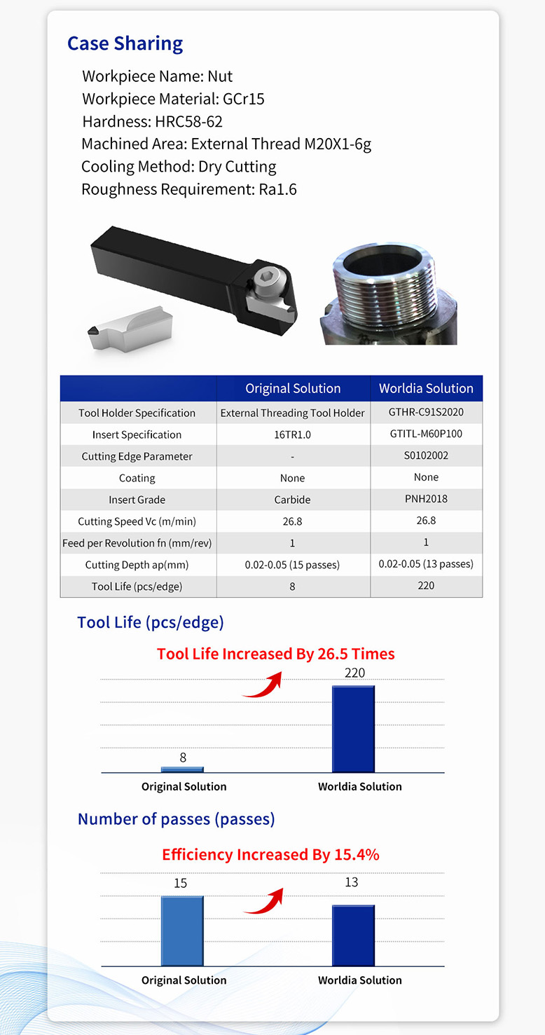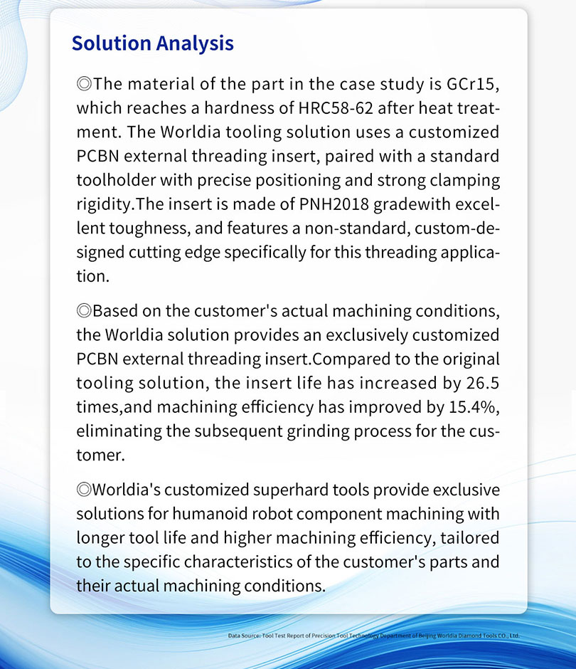 ◎Based on the customer’s actual machining conditions, the Worldia solution provides an exclusively customized PCBN external threading insert.Compared to the original tooling solution, the insert life has increased by 26.5 times,and machining efficiency has improved by 15.4%, eliminating the subsequent grinding process for the customer.