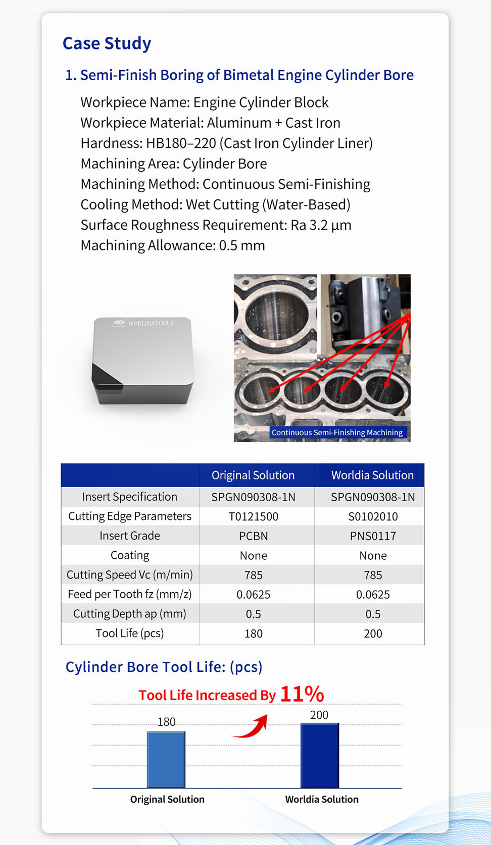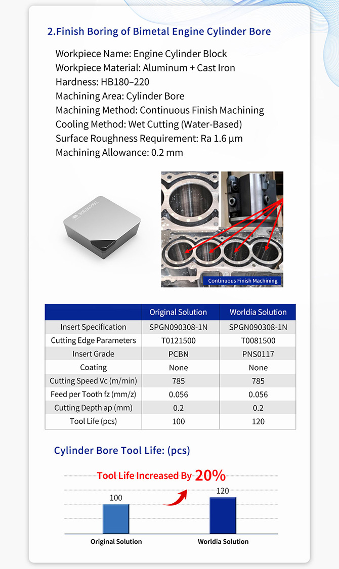 Compared with the original solution, Worldia’s customized PCBN tooling solution significantly improved tool life in both semi-finishing and finishing of the cylinder bore. It reduced tool changes and downtime, improved machining efficiency, and lowered overall processing costs for the customer.