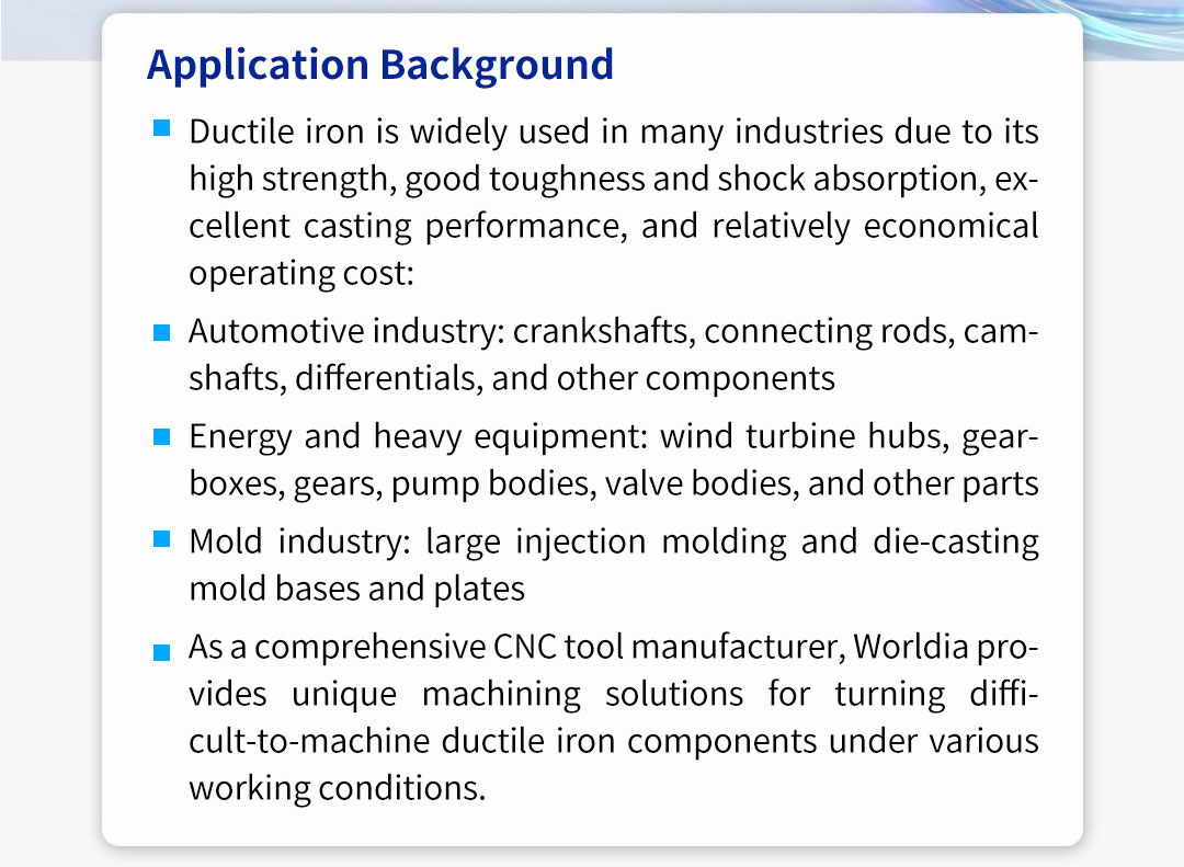 As a comprehensive CNC tool manufacturer, Worldia provides unique machining solutions for turning difficult-to-machine ductile iron components under various working conditions.