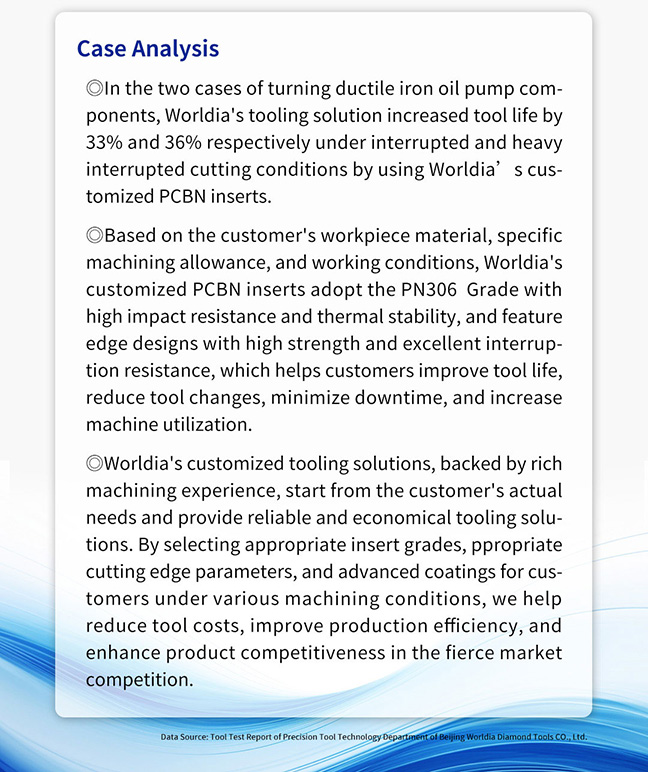 ◎In the two cases of turning ductile iron oil pump components, Worldia’s tooling solution increased tool life by 33% and 36% respectively under interrupted and heavy interrupted cutting conditions by using Worldia’s customized PCBN inserts.