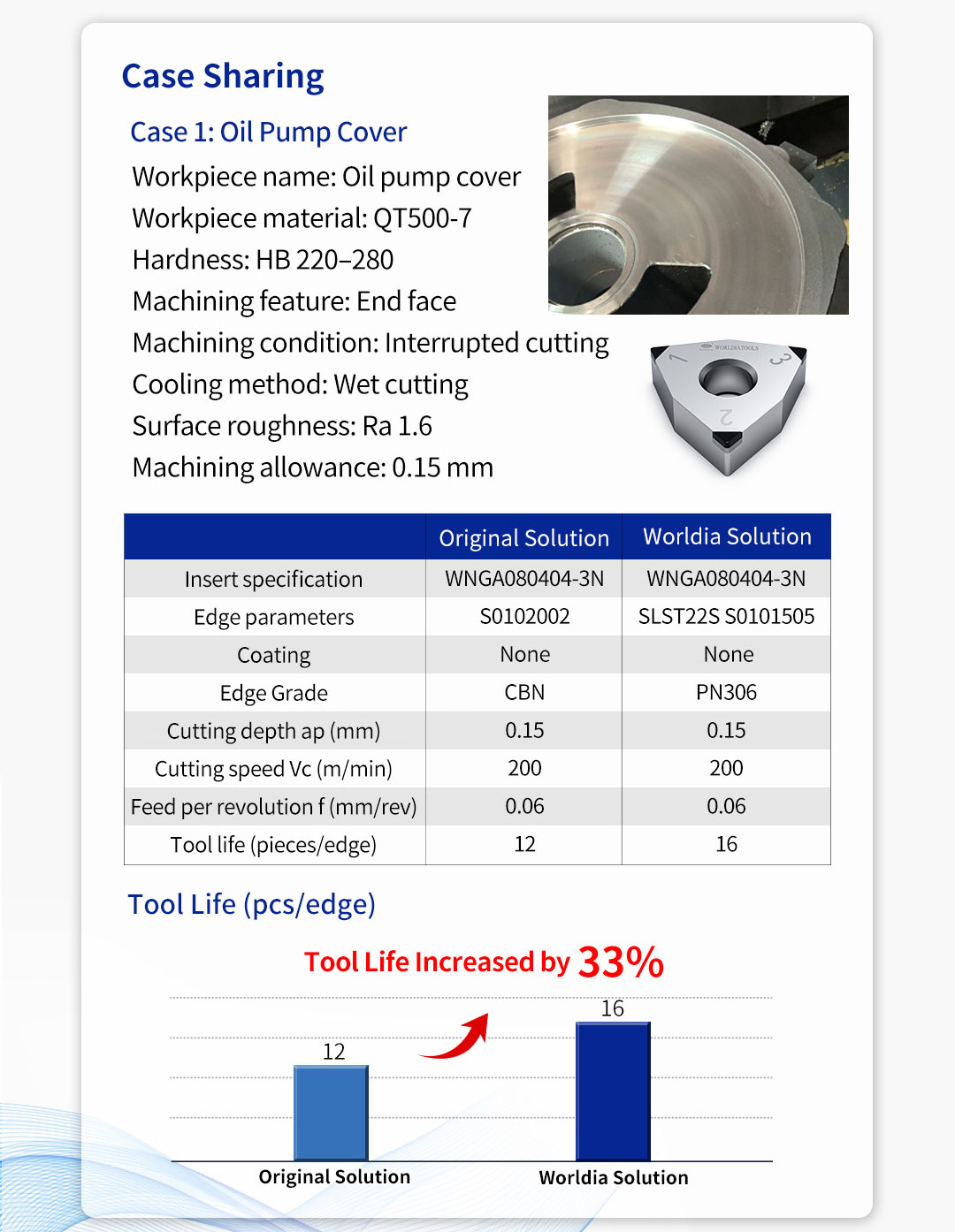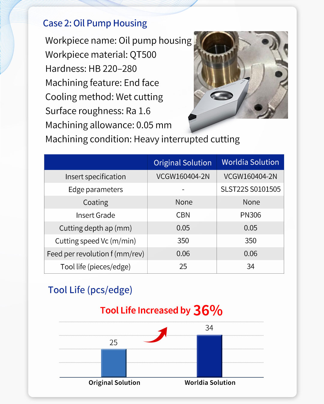 ◎In the two cases of turning ductile iron oil pump components, Worldia’s tooling solution increased tool life by 33% and 36% respectively under interrupted and heavy interrupted cutting conditions by using Worldia’s customized PCBN inserts.