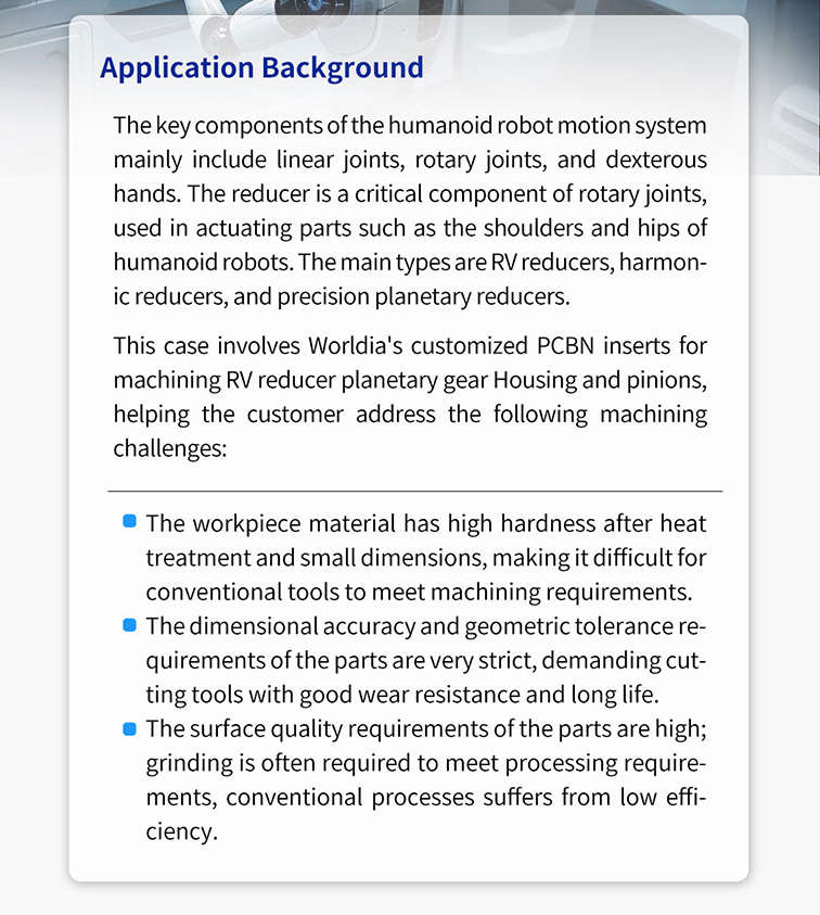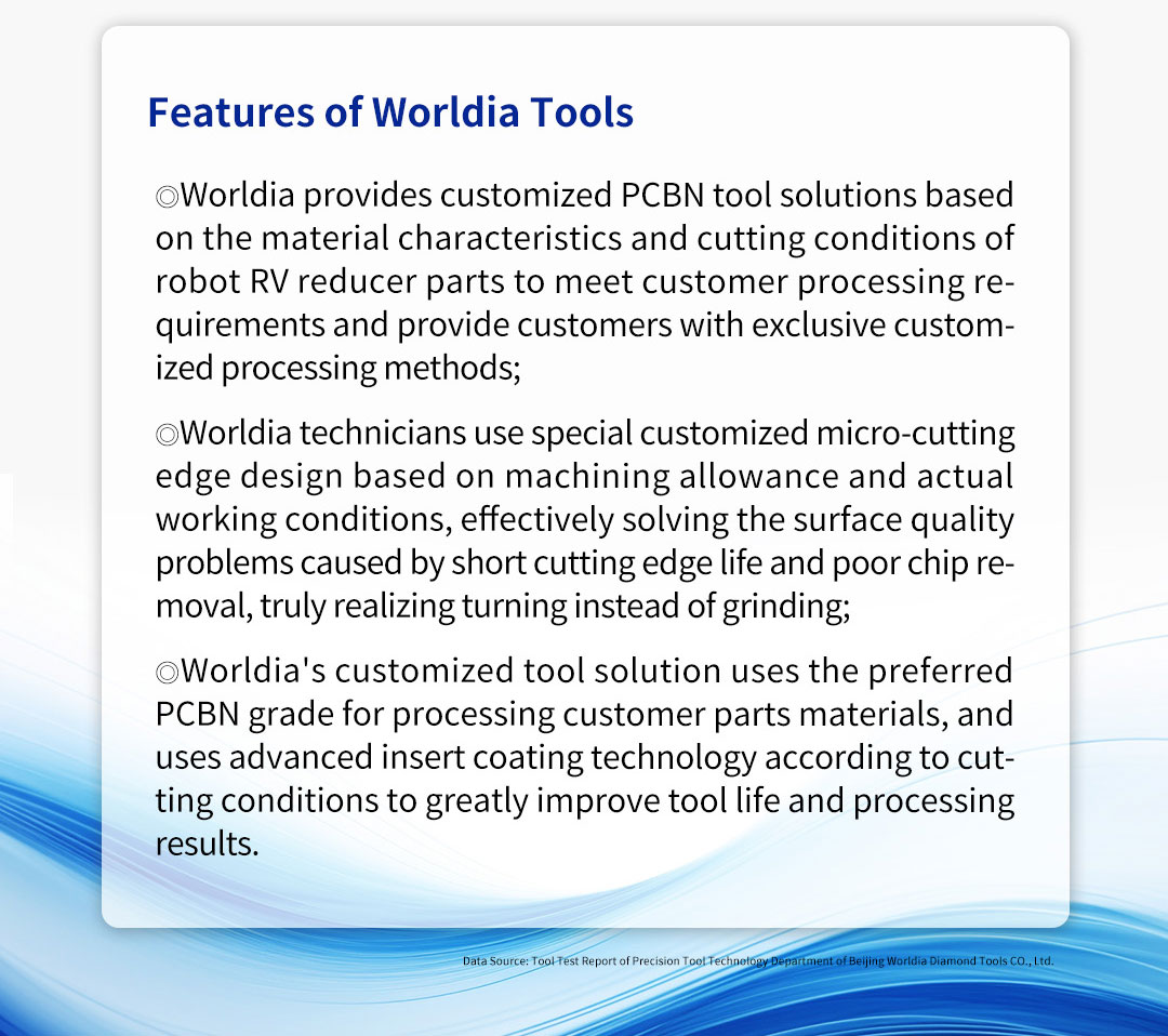 ◎Worldia provides customized PCBN tool solutions based on the material characteristics and cutting conditions of robot RV reducer parts to meet customer processing requirements and provide customers with exclusive customized processing methods;