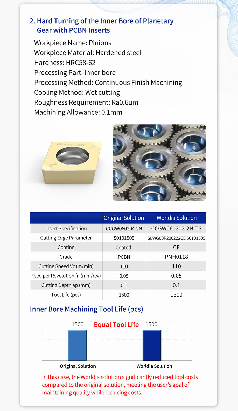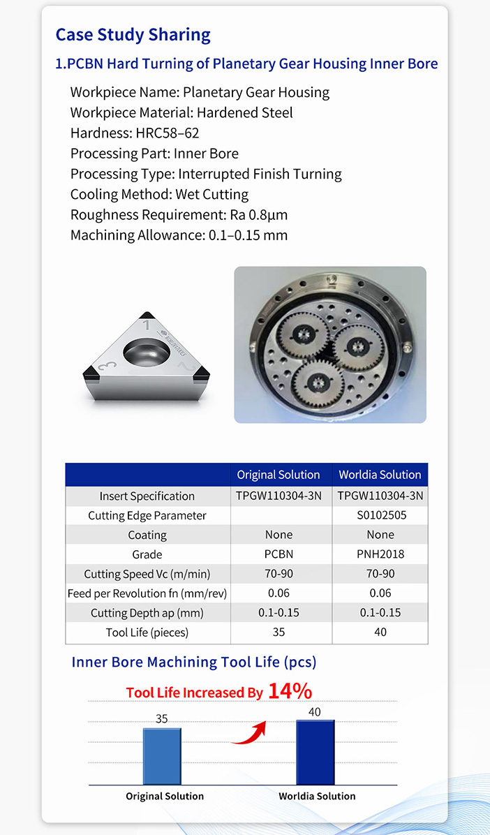 This case involves Worldia’s customized PCBN inserts for machining RV reducer planetary gear Housing and pinions, helping the customer address the following machining challenges: